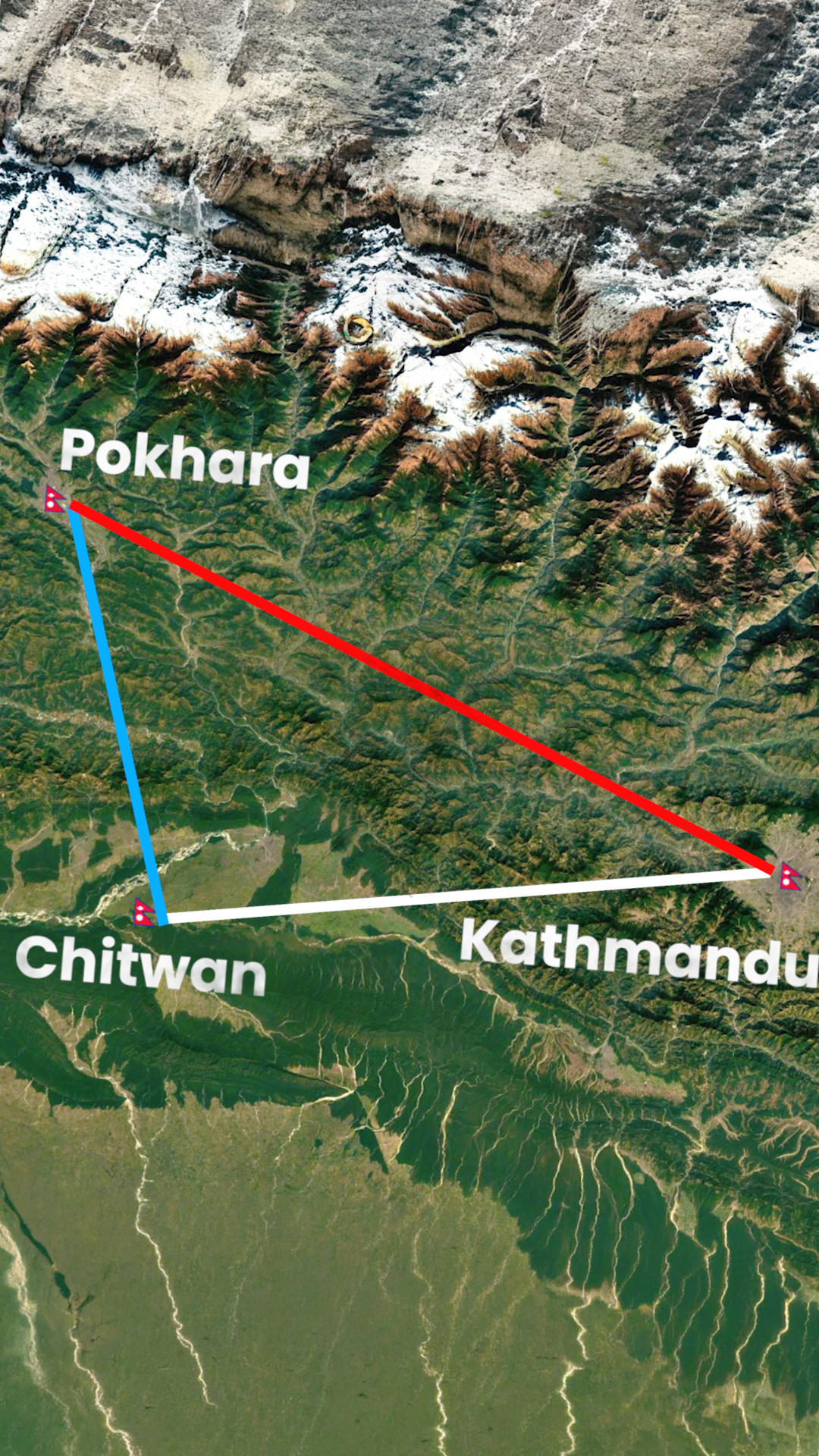 It refers to the three most popular travel destinations — Kathmandu, Pokhara, and Chitwan,  showcasing Nepal’s culture, adventure, and wildlife in one trip.